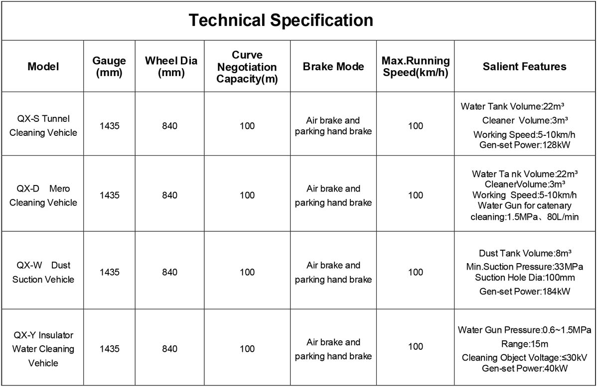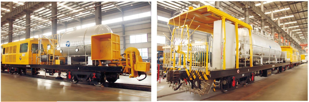 Water Cleaning Vehicle is applicable for cleaning work on railway.It has the function of cleaning the ponding, dust,sands,metal powder,sediments,garbage etc.of ballast bed,drainage ditch,water-gathering well,tunnel walls.It can be used to clean the insulators of catenary cables without power cut off.All the vehicles are based on mature technology of PC-30/40 flat wagon.Multiple functions can be realized by different combinations of high-pressure water gun,water cannon,sweeping brush,fan nozzle and suction device.